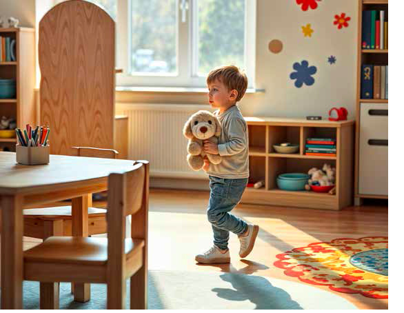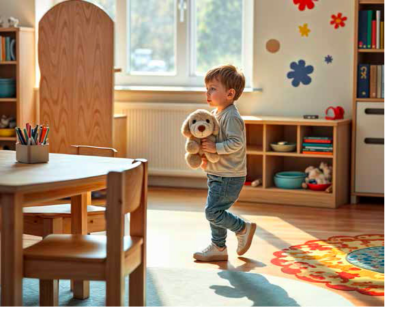 Im KI-ndi der Zukunft bekommen Kinder den Raum und die Zeit, die sie für ihre Entwicklung brauchen. Dieser Knabe braucht zum Beispiel den Gruppenraum der sechziger Jahre, schön mit Prilblumen-Deko. Den sollen er und sein plüschiger Ko-Konstrukteur Moppi natürlich auch haben.