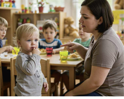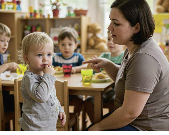 Unbelegte Plätze? Im KI-ndi der Zukunft gibt’s sowas nicht. Das liegt an Erziehern wie unserem KI-anu Schäufele aus Dimpfeldingen, der selbst Hand… ähem… angelegt hatte, um die neue Generation Gruppenkinder zu erzeugen. Hier sieht man ihn übrigens beim gemeinsamen Vernichten der verräterischen DNA-Testsequenzen, aus denen die Kinder Papier-Blumenkohl kneten.