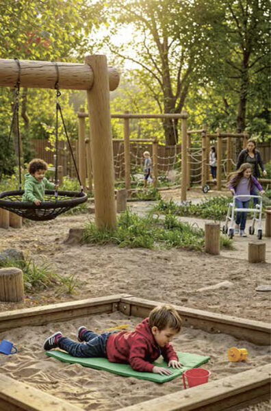 Im KI-ndi der Zukunft sagt man ja zur Integration! Jeder hat seinen Platz: KI-lian, der noch nicht weiß, dass eine Schaukel ohne Schwung nicht funktioniert. KI-m mit dem Sauberkeitsfimmel, der sich nie ohne Isomatte in den Sand legen würde. Und KI-ara, die weiß, dass man selbst mit dem Rollator Spaß im Garten hat, wenn man den Weg nicht verlässt.