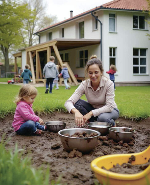 Trotz der erfreulichen Zunahme des Männeranteils spielen Frauen auch im KI-ndi der Zukunft eine nicht wegzudenkende Rolle. Egal, wie zurückhaltend sie agieren – hier Erzieherin KI-rstin, die aus Angst vor einer Spielzeugallergie Bausteine nur mit Schutztuch anfasst –, optisch sind sie immer noch eine Bereicherung. Erst recht in Schürzchen!