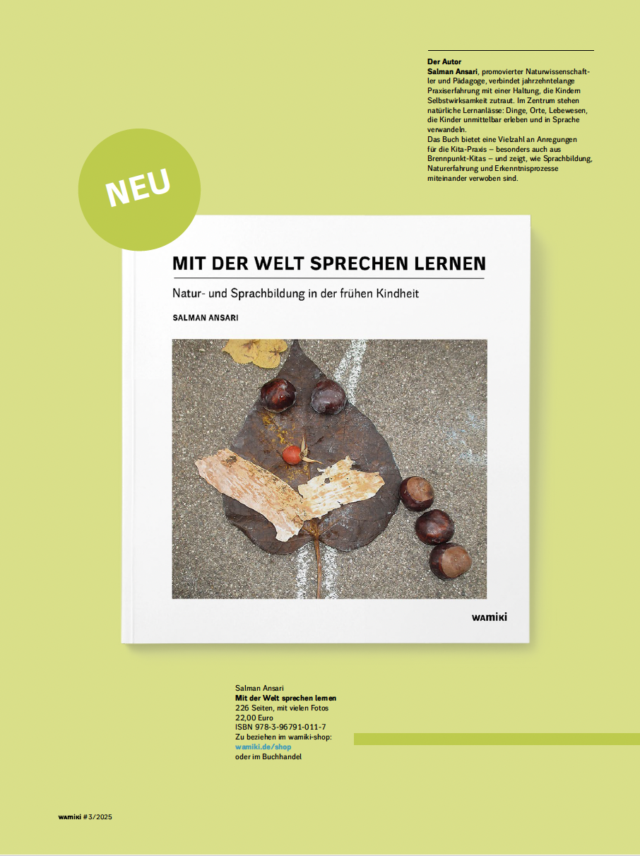Natur ist dafür ein großartiger Lernraum: lebendig, sinnlich, voller Fragen. Kinder lernen dort, indem sie sehen, staunen, forschen, erzählen. Lernen beginnt nicht im Kopf, sondern in den Sinnen. Mein neues Buch erzählt von solchen Räumen: gewachsen in der Praxis, gemeinsam mit engagierten Kita-Teams in Brennpunkten. Es zeigt, wie Natur zu einem Ort wird, an dem Sprache, Selbstwirksamkeit und Weltverstehen zusammenfinden – spielerisch, neugierig, echt.“