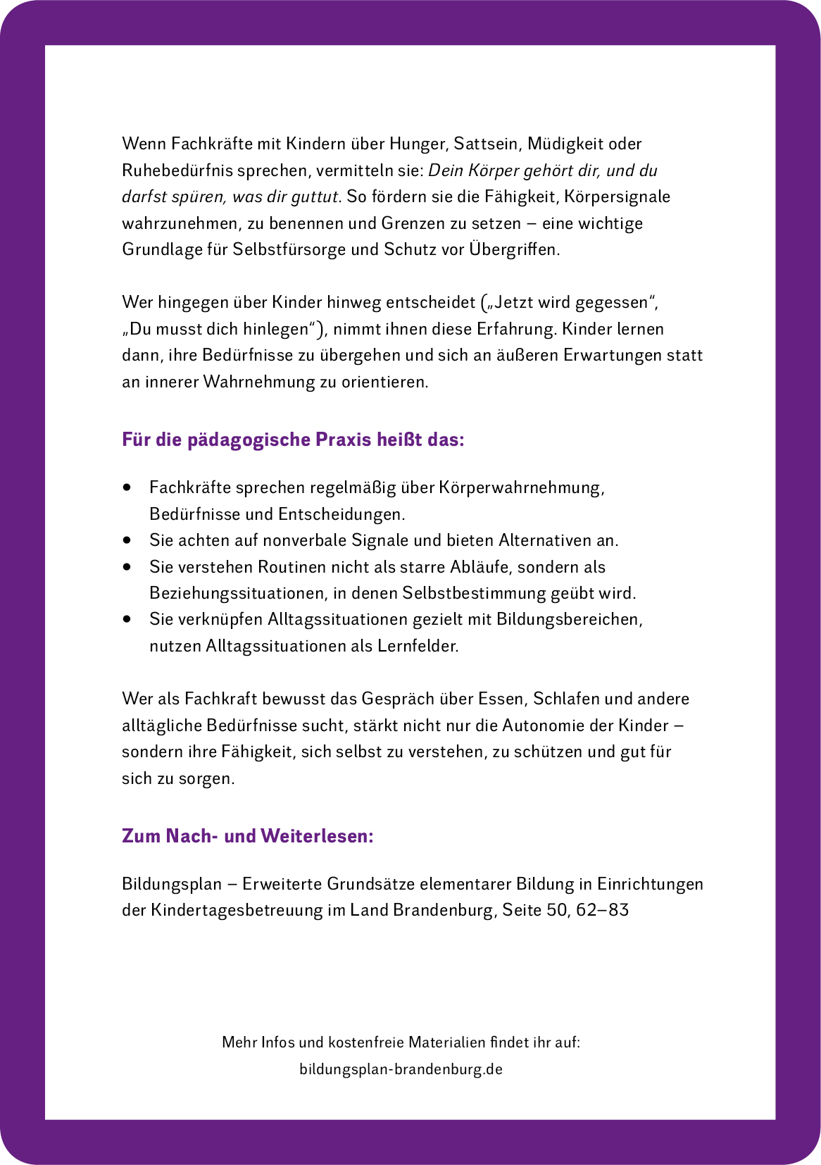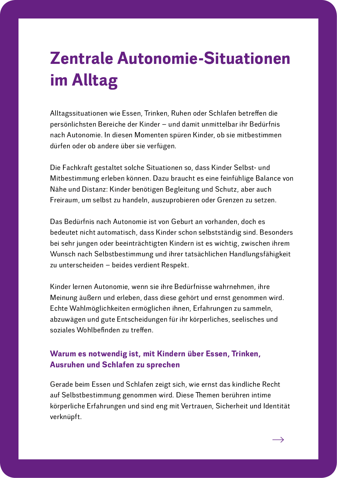 - Kinder lernen, ihre Bedürfnisse wahrzunehmen: „Bin ich satt?“ – „Bin ich müde?“