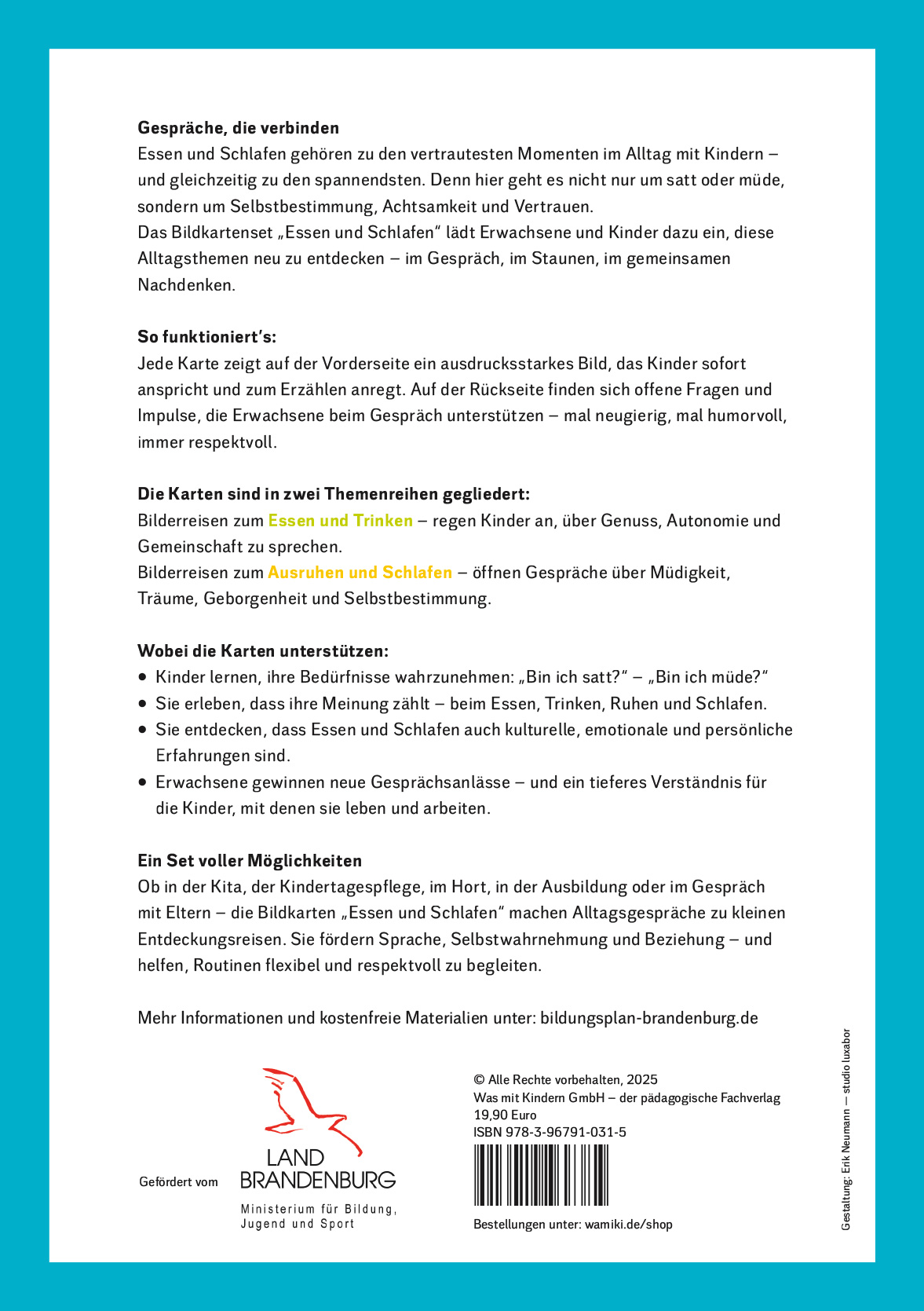 Ob in der Kita, der Kindertagespflege, im Hort, in der Ausbildung oder im Gespräch mit Eltern – die Bildkarten „Essen und Schlafen“ machen Alltagsgespräche zu kleinen Entdeckungsreisen. Sie fördern Sprache, Selbstwahrnehmung und Beziehung – und helfen, Routinen flexibel und respektvoll zu begleiten.Bildkartenset: Essen und Schlafen